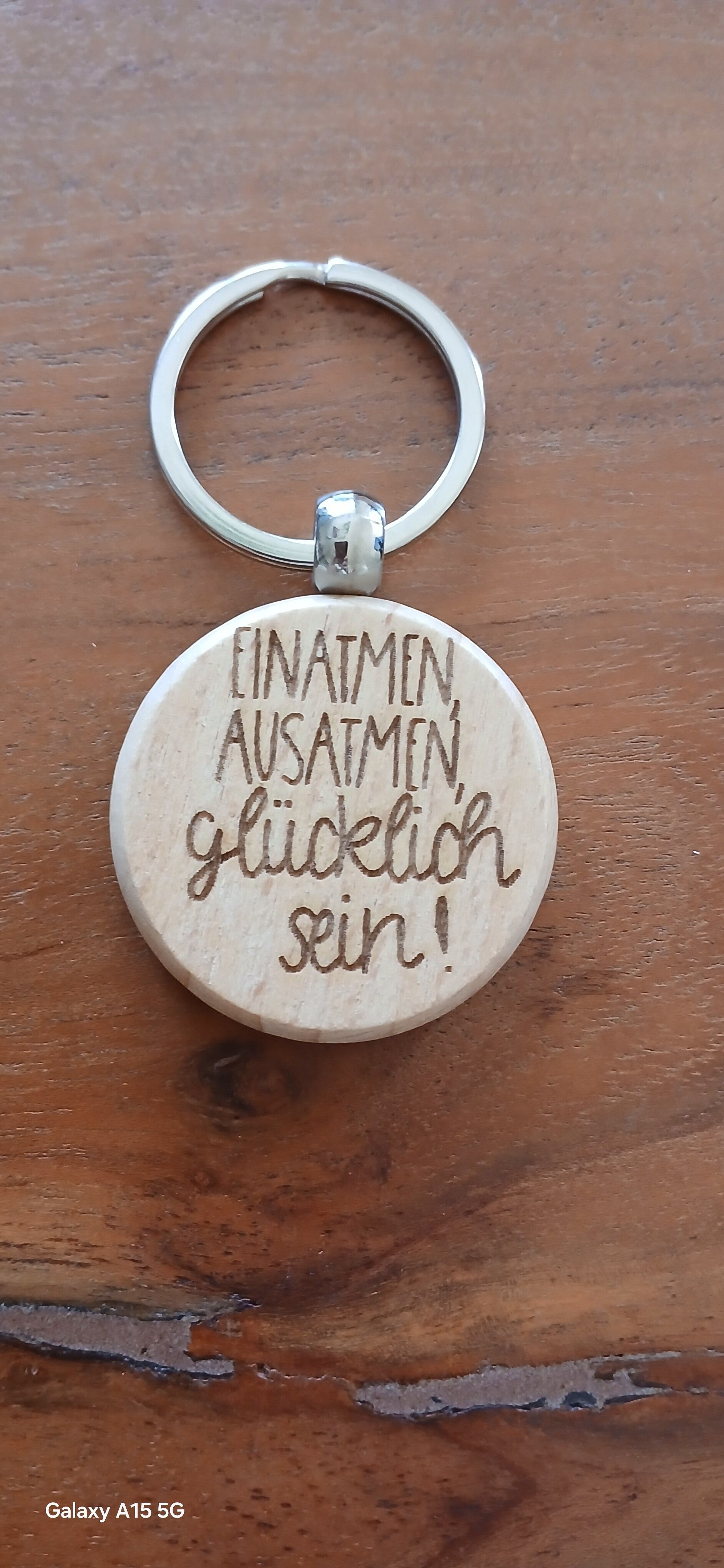 Schlüsselanhänger aus Holz "Einatmen ausatmen glücklich sein"